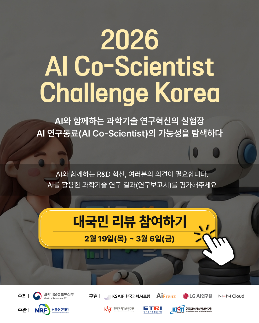 과학기술정보통신부에서 진행하는 「2026 AI Co-Scientist Challenge Korea」는 AI를 활용한 과학기술 연구 혁신 사례를 발굴하고 확산하기 위한 경진대회입니다.